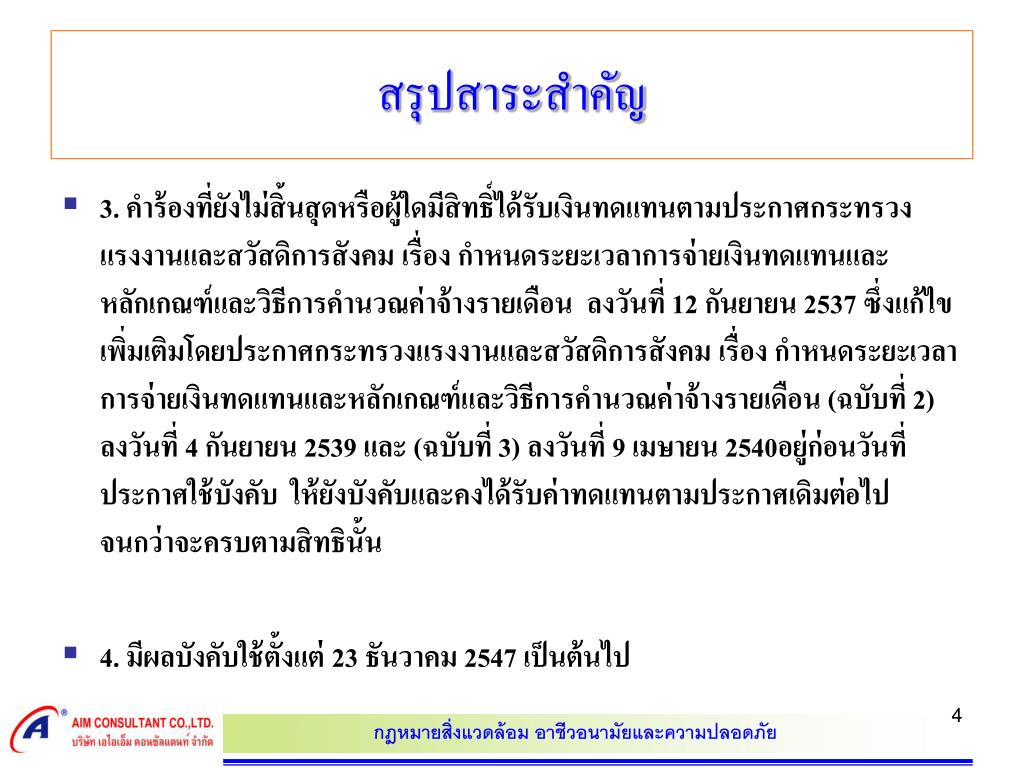 สรุปสาระสำคัญ • 3. คำร้องที่ยังไม่สิ้นสุดหรือผู้ใดมีสิทธิ์ได้รับเงินทดแทนตามประกาศกระทรวงแรงงานและสวัสดิการสังคม เรื่อง กำหนดระยะเวลาการจ่ายเงินทดแทนและหลักเกณฑ์และวิธีการคำนวณค่าจ้างรายเดือน ลงวันที่ 12 กันยายน 2537 ซึ่งแก้ไขเพิ่มเติมโดยประกาศกระทรวงแรงงานและสวัสดิการสังคม เรื่อง กำหนดระยะเวลาการจ่ายเงินทดแทนและหลักเกณฑ์และวิธีการคำนวณค่าจ้างรายเดือน (ฉบับที่ 2) ลงวันที่ 4 กันยายน 2539 และ (ฉบับที่ 3) ลงวันที่ 9 เมษายน 2540อยู่ก่อนวันที่ประกาศใช้บังคับ ให้ยังบังคับและคงได้รับค่าทดแทนตามประกาศเดิมต่อไปจนกว่าจะครบตามสิทธินั้น • 4. มีผลบังคับใช้ตั้งแต่ 23 ธันวาคม 2547 เป็นต้นไป