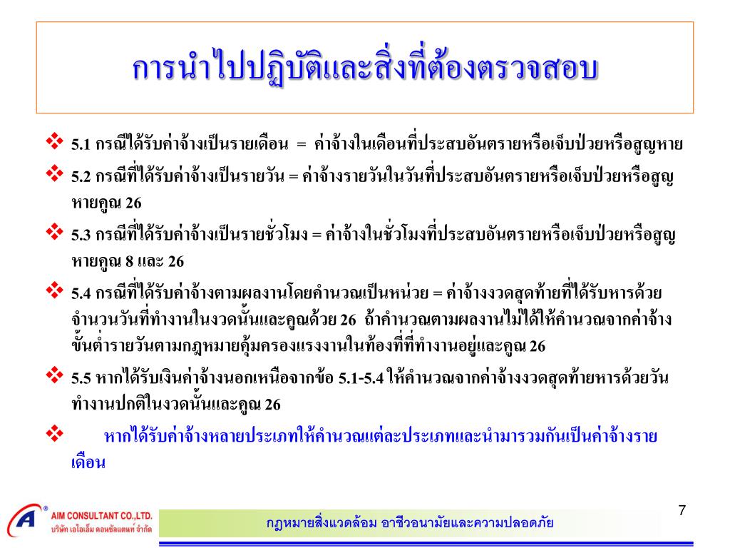 การนำไปปฏิบัติและสิ่งที่ต้องตรวจสอบการนำไปปฏิบัติและสิ่งที่ต้องตรวจสอบ • 5.1 กรณีได้รับค่าจ้างเป็นรายเดือน = ค่าจ้างในเดือนที่ประสบอันตรายหรือเจ็บป่วยหรือสูญหาย • 5.2 กรณีที่ได้รับค่าจ้างเป็นรายวัน = ค่าจ้างรายวันในวันที่ประสบอันตรายหรือเจ็บป่วยหรือสูญหายคูณ 26 • 5.3 กรณีที่ได้รับค่าจ้างเป็นรายชั่วโมง = ค่าจ้างในชั่วโมงที่ประสบอันตรายหรือเจ็บป่วยหรือสูญหายคูณ 8 และ 26 • 5.4 กรณีที่ได้รับค่าจ้างตามผลงานโดยคำนวณเป็นหน่วย = ค่าจ้างงวดสุดท้ายที่ได้รับหารด้วยจำนวนวันที่ทำงานในงวดนั้นและคูณด้วย 26 ถ้าคำนวณตามผลงานไม่ได้ให้คำนวณจากค่าจ้างขั้นต่ำรายวันตามกฎหมายคุ้มครองแรงงานในท้องที่ที่ทำงานอยู่และคูณ 26 • 5.5 หากได้รับเงินค่าจ้างนอกเหนือจากข้อ 5.1-5.4 ให้คำนวณจากค่าจ้างงวดสุดท้ายหารด้วยวันทำงานปกติในงวดนั้นและคูณ 26 • หากได้รับค่าจ้างหลายประเภทให้คำนวณแต่ละประเภทและนำมารวมกันเป็นค่าจ้างรายเดือน