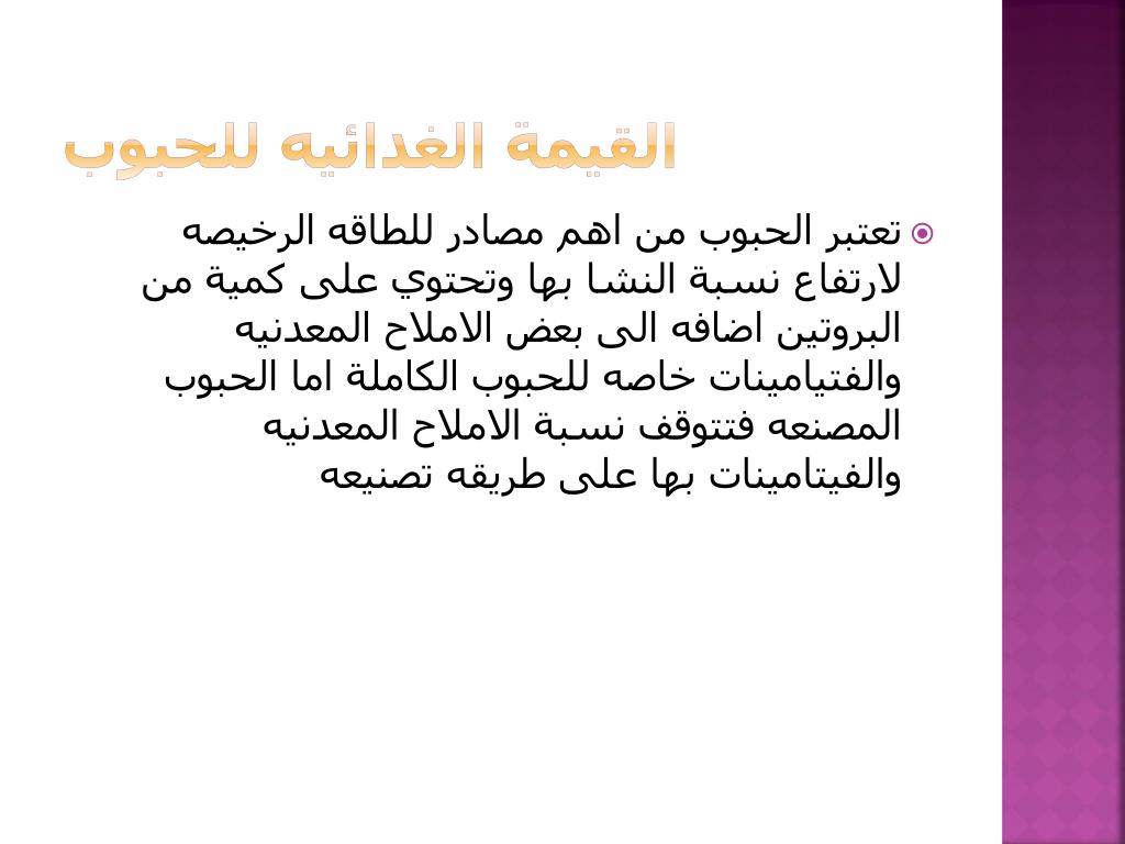 القيمة الغدائيه للحبوب • تعتبر الحبوب من اهم مصادر للطاقهالرخيصه لارتفاع نسبة النشا بها وتحتوي على كمية من البروتين اضافهالى بعض الاملاحالمعدنيهوالفتياميناتخاصه للحبوب الكاملة اما الحبوب المصنعه فتتوقف نسبة الاملاحالمعدنيه والفيتامينات بها على طريقه تصنيعه