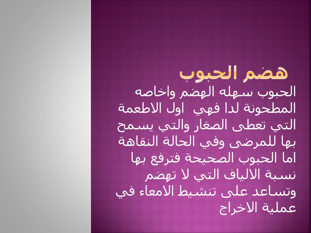 هضم الحبوب الحبوب سهله الهضم واخاصه المطحونة لدا فهي اولالاطعمة التي تعطى الصغار والتي يسمح بها للمرضى وفي الحالة النقاهة اما الحبوب الصحيحة فترفع بها نسبة الالياف التي لا تهضم وتساعد على تنشيط الامعاء في عملية الاخراج