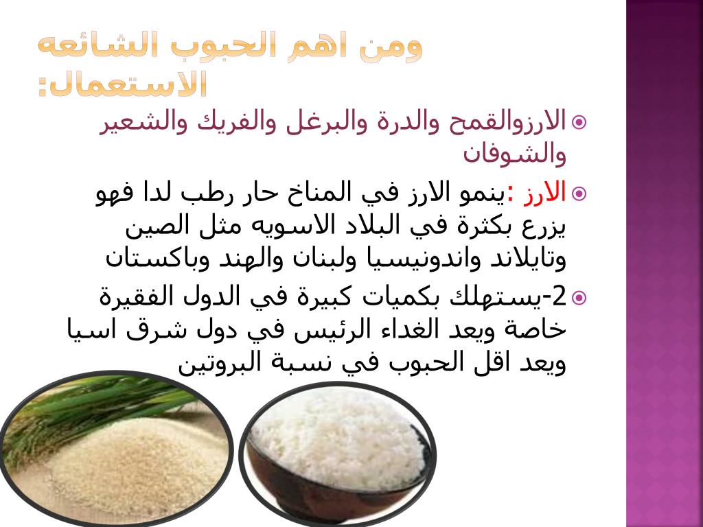 ومن اهم الحبوب الشائعه الاستعمال: • الارزوالقمح والدرة والبرغل والفريك والشعير والشوفان • الارز :ينمو الارز في المناخ حار رطب لدا فهو يزرع بكثرة في البلاد الاسويه مثل الصين وتايلاند واندونيسيا ولبنان والهند وباكستان • 2-يستهلك بكميات كبيرة في الدول الفقيرة خاصة ويعد الغداء الرئيس في دول شرق اسيا ويعد اقل الحبوب في نسبة البروتين