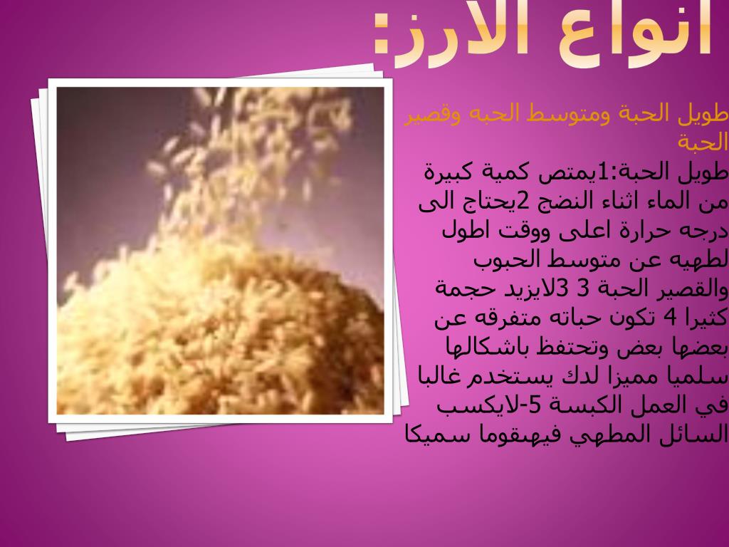 انواعالارز: طويل الحبة ومتوسط الحبه وقصير الحبة طويل الحبة:1يمتص كمية كبيرة من الماء اثناء النضج 2يحتاج الى درجه حرارة اعلى ووقت اطول لطهيه عن متوسط الحبوب والقصير الحبة 3 3لايزيد حجمة كثيرا 4 تكون حباته متفرقه عن بعضها بعض وتحتفظ باشكالها سلميا مميزا لدك يستخدم غالبا في العمل الكبسة 5-لايكسب السائل المطهيفيهىقوما سميكا