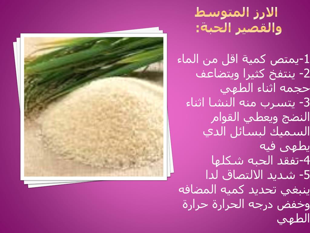 الارز المتوسط والقصير الحبة: 1-يمتص كمية اقل من الماء 2- ينتفخ كثيرا ويتضاعف حجمه اثناء الطهي 3- يتسرب منه النشا اثناء النضج ويعطي القوام السميك لبسائلالدي يطهى فيه 4-تفقد الحبه شكلها 5- شديد الالتصاق لدا ينبغي تحديد كميه المضافه وخفض درجه الحرارة حرارة الطهي