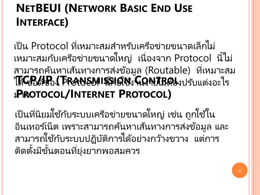 NetBEUI (Network Basic End Use Interface) เป็น Protocol ที่เหมาะสมสำหรับเครือข่ายขนาดเล็กไม่เหมาะสมกับเครือข่ายขนาดใหญ่ เนื่องจาก Protocol นี้ไม่สามารถค้นหาเส้นทางการส่งข้อมูล (Routable) ที่เหมาะสมได้ ข้อดีของ Protocol นี้คือใช้งานง่ายไม่ต้องปรับแต่งอะไรมาก TCP/IP (Transmission Control Protocol/Internet Protocol) เป็นที่นิยมใช้กับระบบเครือข่ายขนาดใหญ่ เช่น ถูกใช้ในอินเทอร์เน็ต เพราะสามารถค้นหาเส้นทางการส่งข้อมูล และสามารถใช้กับระบบปฏิบัติการได้อย่างกว้างขวาง แต่การติดตั้งมีขั้นตอนที่ยุ่งยากพอสมควร