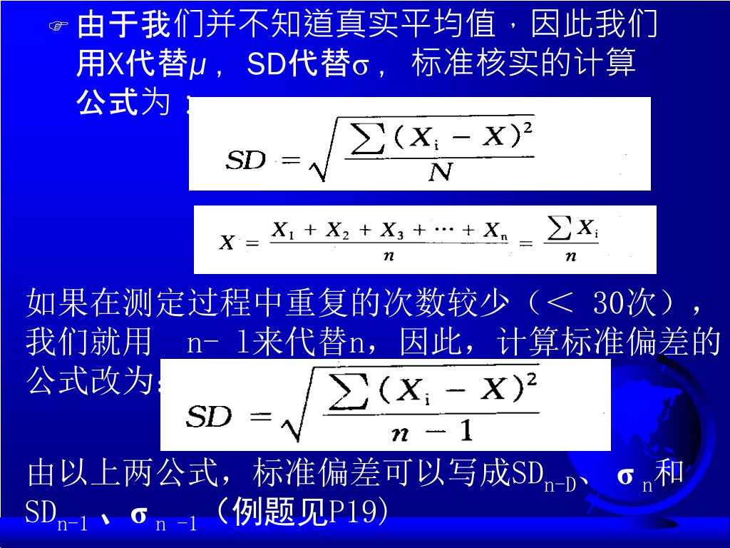 由于我们并不知道真实平均值,因此我们用X代替μ ,SD代替σ ,标准核实的计算公式为: 如果在测定过程中重复的次数较少(< 30次),我们就用 n-l来代替n,因此,计算标准偏差的公式改为: 由以上两公式,标准偏差可以写成SDn-D、 σ n和SDn-1、σ n -1(例题见P19)
