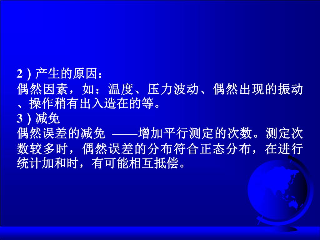 2)产生的原因: 偶然因素,如:温度、压力波动、偶然出现的振动、操作稍有出入造在的等。 3)减免 偶然误差的减免——增加平行测定的次数。测定次数较多时,偶然误差的分布符合正态分布,在进行统计加和时,有可能相互抵偿。