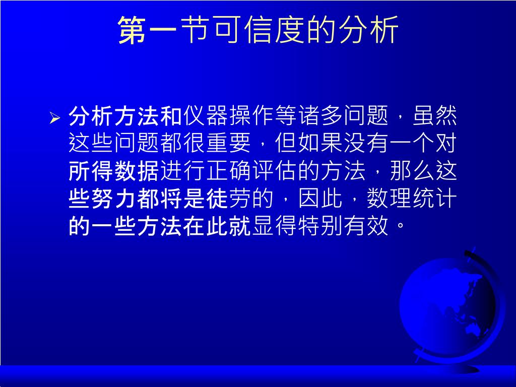 第一节可信度的分析 • 分析方法和仪器操作等诸多问题,虽然这些问题都很重要,但如果没有一个对所得数据进行正确评估的方法,那么这些努力都将是徒劳的,因此,数理统计的一些方法在此就显得特别有效。