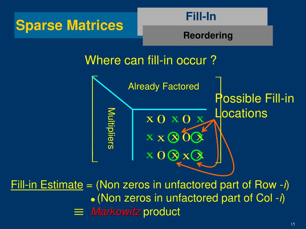 Possible Fill-in Locations Fill-in Estimate = (Non zeros in unfactored part of Row -i) (Non zeros in unfactored part of Col -i) Markowitz product Fill-In Sparse Matrices Reordering Where can fill-in occur ? Already Factored Multipliers