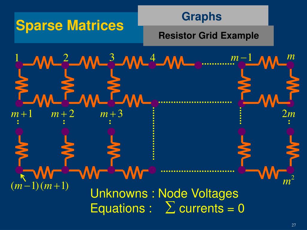 Applications Sparse Matrices Resistor Grid Unknowns : Node Voltages Equations : currents = 0