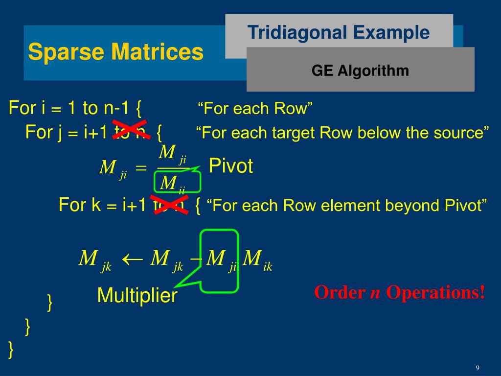 Pivot Multiplier Tridiagonal Example Sparse Matrices GE Algorithm For i = 1 to n-1 {“For each Row” For j = i+1 to n {“For each target Row below the source” For k = i+1 to n {“For each Row element beyond Pivot” } } } Order n Operations!