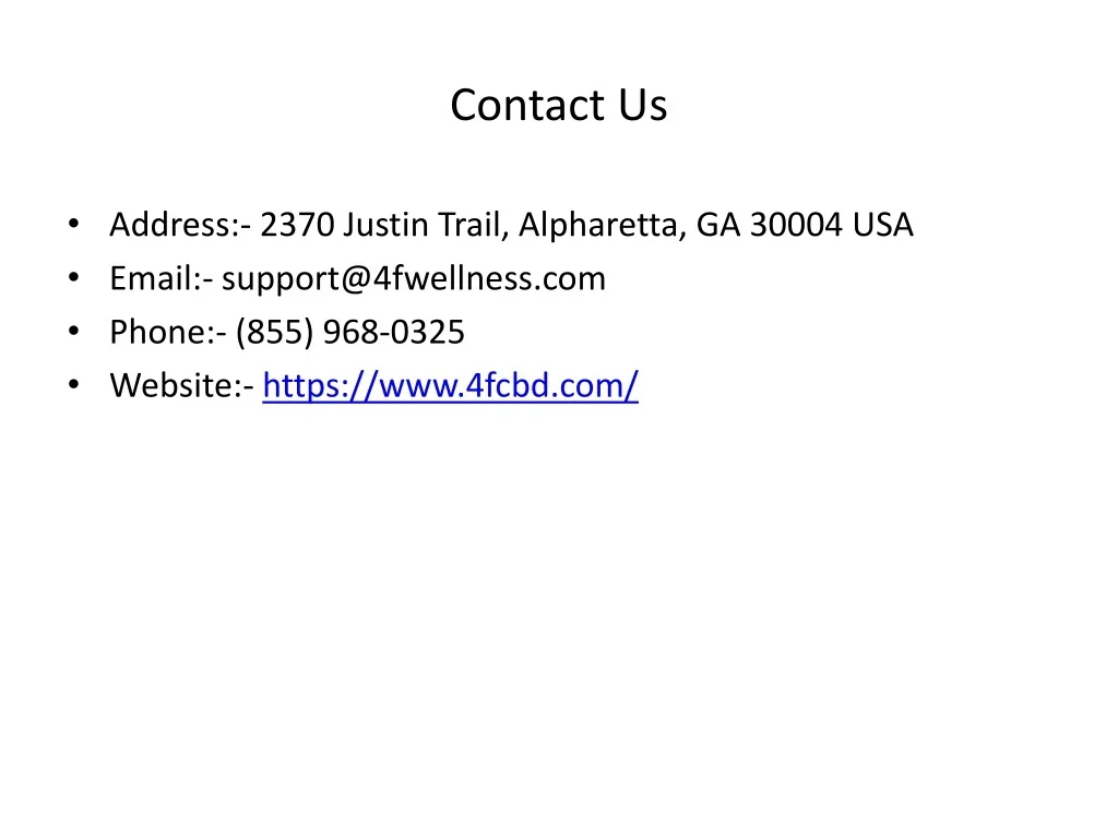 Contact Us • Address:- 2370 Justin Trail, Alpharetta, GA 30004 USA • Email:- support@4fwellness.com • Phone:- (855) 968-0325 • Website:- https://www.4fcbd.com/