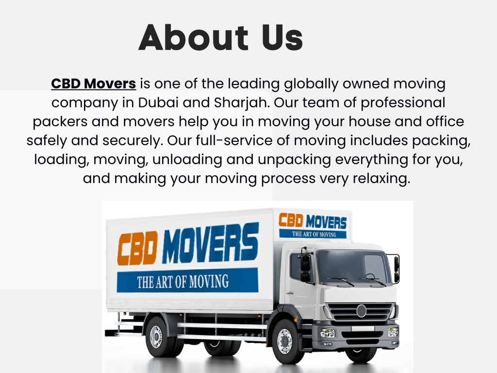 About Us CBD Movers is one of the leading globally owned moving company in Dubai and Sharjah. Our team of professional packers and movers help you in moving your house and office safely and securely. Our full-service of moving includes packing, loading, moving, unloading and unpacking everything for you, and making your moving process very relaxing.