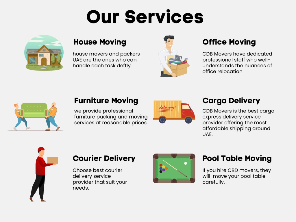 Our Services House Moving Office Moving house movers and packers UAE are the ones who can handle each task deftly. CDB Movers have dedicated professional staff who well- understands the nuances of office relocation Furniture Moving we provide professional furniture packing and moving services at reasonable prices. Cargo Delivery CDB Movers is the best cargo express delivery service provider offering the most affordable shipping around UAE. Courier Delivery Pool Table Moving Choose best courier delivery service provider that suit your needs. If you hire CBD movers, they will move your pool table carefully.