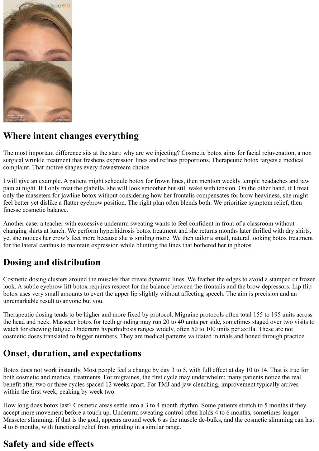 Is botox safe? When administered by a trained clinician using appropriate dosing, yes for most healthy adults. The most common side effects are mild: small pinprick marks, a bruise or two, a dull headache, a feeling of tightness while the toxin settles. Cosmetic risks include eyelid droop if the wrong area is flooded or product diffuses beyond the target. That usually resolves as the effect wears off, but it is frustrating and preventable with good technique and careful aftercare. Therapeutic botox has its own profile. Masseter injections can cause chewing fatigue, particularly with hard foods, for 1 to 3 weeks. Neck injections for migraines can produce temporary neck stiffness. Palmar hyperhidrosis treatment can lead to transient hand weakness, which is why exact depth and placement matter. If you rely on fine motor control for work, we plan timing carefully. Medical history matters. People who are pregnant or breastfeeding should postpone treatment. Those with certain neuromuscular disorders require careful evaluation. Let your injector know about blood thinners, current antibiotics, and recent illnesses. The pre‑visit screening may feel detailed. It is there to keep you safe. Aftercare that actually helps I give the same core instructions whether the visit was for botox for wrinkles or for migraines. Do not rub or massage the treated areas for the rest of the day. Skip saunas, hot yoga, and strenuous workouts for 24 hours. Stay upright for 4 hours. Avoid alcohol that evening to reduce swelling and bruising risk. You can wash your face gently and apply light makeup after a few hours. If you tend to bruise, an ice pack on and off for the first hour helps. If a small bruise appears, it usually fades over several days. Patients often ask, can you work out after botox? Waiting a day is reasonable. Can you drink after botox? A glass of water is great; save wine or cocktails for tomorrow. These small steps lower the chance of product shifting and help minimize side effects. Choosing the right injector and setting Experience shows in both outcomes and how smoothly the appointment goes. The best botox clinic for you may not be the closest or the cheapest. Look for a clinician who does a full consultation, examines how you animate, and discusses trade‑offs. It should never feel like a sales pitch. Same day botox can be convenient, but I still prefer a first visit that includes photos, a plan, then injections once the patient understands the approach. For medical botox, confirm the provider treats your condition regularly. Ask how they assess response, how they handle partial nearby botox services response, and whether they coordinate with your neurologist or dentist if you are being treated for migraines or TMJ. Insurance may cover therapeutic botox when criteria are met, but the practice should help you navigate authorization and timelines. Cosmetic versus therapeutic: a quick comparison Intent: Cosmetic botox aims to soften dynamic lines and balance facial features. Therapeutic botox targets symptoms from overactive muscles or glands, like migraines or excessive sweating. Dosing and mapping: Cosmetic dosing is customized per feature and expression pattern. Therapeutic dosing follows protocols with higher total units and broader mapping. Results: Cosmetic results are judged by natural expression and smoother skin. Therapeutic results are measured by metrics like fewer headache days or reduced sweat volume. Duration and frequency: Cosmetic visits every 3 to 4 months. Therapeutic visits often every 12 weeks, with some conditions stretching longer between sessions. Coverage and cost: Cosmetic is out of pocket, priced per unit or per area. Therapeutic may be covered by insurance with documentation; out‑of‑pocket pricing varies by geography and dose. Cost, pricing structures, and value How much does botox cost depends on your market, the injector’s expertise, and whether you pay per unit or per area. In many U.S. cities, botox pricing per unit sits between 10 and 20 dollars. A forehead, when priced per area, might be quoted as a flat fee that assumes an average number of units. I prefer transparency with units because faces are not average. A petite dose for baby botox forehead may only need 6 to 10 units, while a heavy brow with strong frontalis may need much more. Therapeutic botox cost can be substantial because of the unit count. Insurance coverage for migraines botox treatment usually requires proof of chronic migraine and prior trials of preventive medications. Hyperhidrosis botox treatment