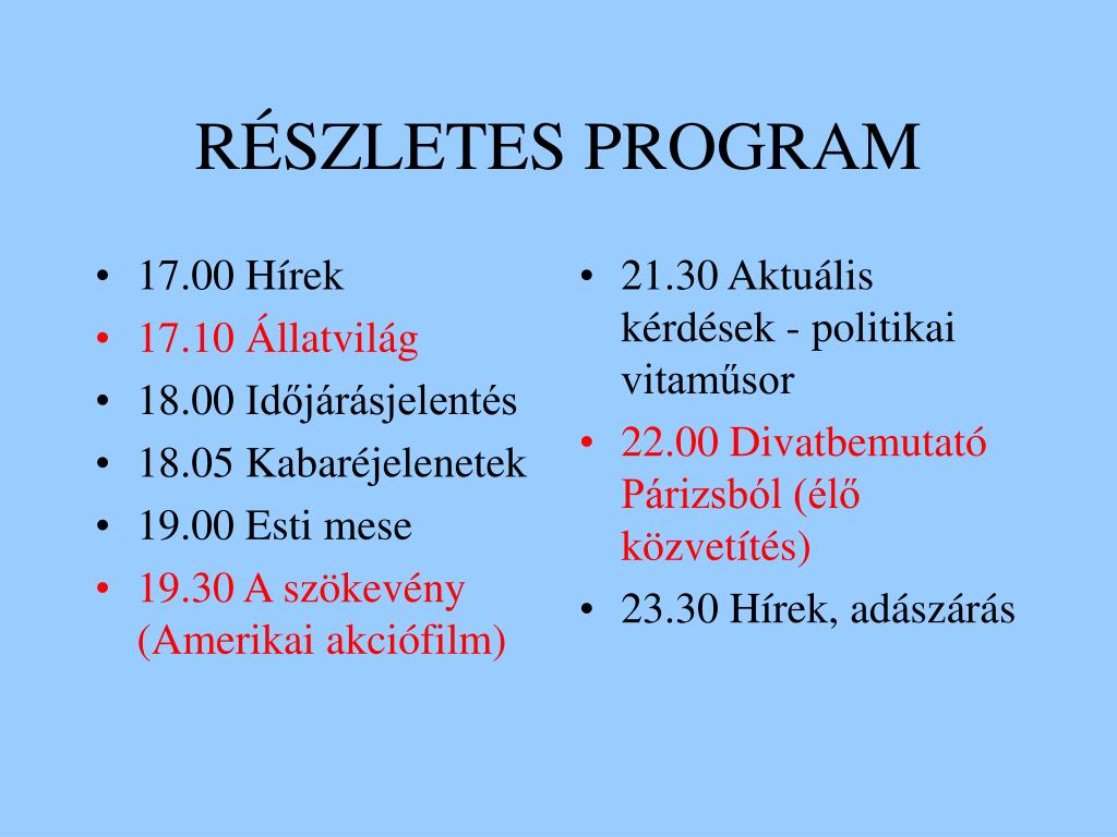 17.00 Hírek 17.10 Állatvilág 18.00 Időjárásjelentés 18.05 Kabaréjelenetek 19.00 Esti mese 19.30 A szökevény (Amerikai akciófilm) 21.30 Aktuális kérdések - politikai vitaműsor 22.00 Divatbemutató Párizsból (élő közvetítés) 23.30 Hírek, adászárás RÉSZLETES PROGRAM