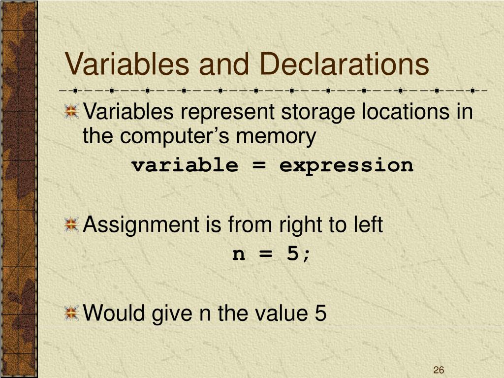 Variables and Declarations • Variables represent storage locations in the computer’s memory variable = expression • Assignment is from right to left n = 5; • Would give n the value 5