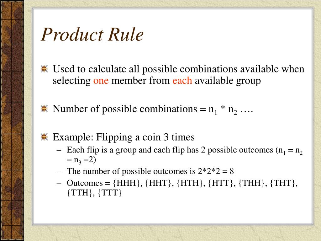 Product Rule • Used to calculate all possible combinations available when selecting one member from each available group • Number of possible combinations = n1 * n2 …. • Example: Flipping a coin 3 times • Each flip is a group and each flip has 2 possible outcomes (n1 = n2 = n3 =2) • The number of possible outcomes is 2*2*2 = 8 • Outcomes = {HHH}, {HHT}, {HTH}, {HTT}, {THH}, {THT}, {TTH}, {TTT}