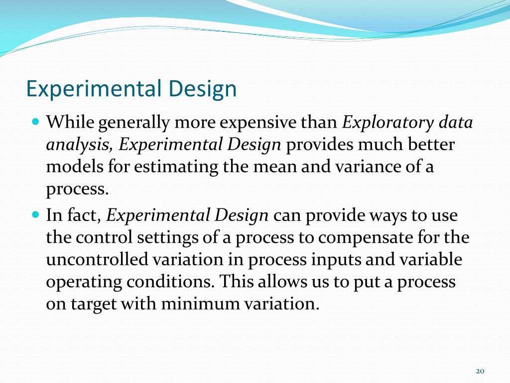 Experimental Design • While generally more expensive than Exploratory data analysis, Experimental Design provides much better models for estimating the mean and variance of a process. • In fact, Experimental Design can provide ways to use the control settings of a process to compensate for the uncontrolled variation in process inputs and variable operating conditions. This allows us to put a process on target with minimum variation.