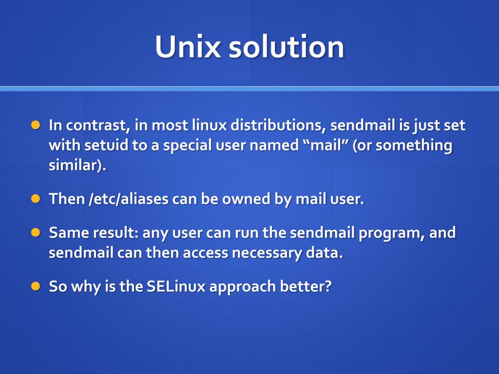 Unix solution • In contrast, in most linux distributions, sendmail is just set with setuid to a special user named “mail” (or something similar). • Then /etc/aliases can be owned by mail user. • Same result: any user can run the sendmail program, and sendmail can then access necessary data. • So why is the SELinux approach better?