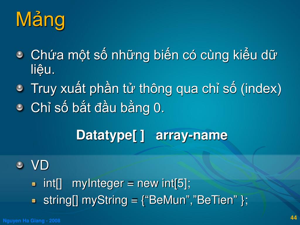 Ngôn ngữ C. ThS. Nguyễn Hà Giang CNTT - HUTECH. Nội dung. Cấu trúc chương trình C# Kiểu dữ liệu, từ khoá, định danh biến, hằng… Chuyển đổi kiểu Console I/O Tham số ref, out, param Lệnh lặp for, while, do while, foreach Lệnh phân nhánh switch, lệnh nhảy Mảng 1 chiều, đa chiều