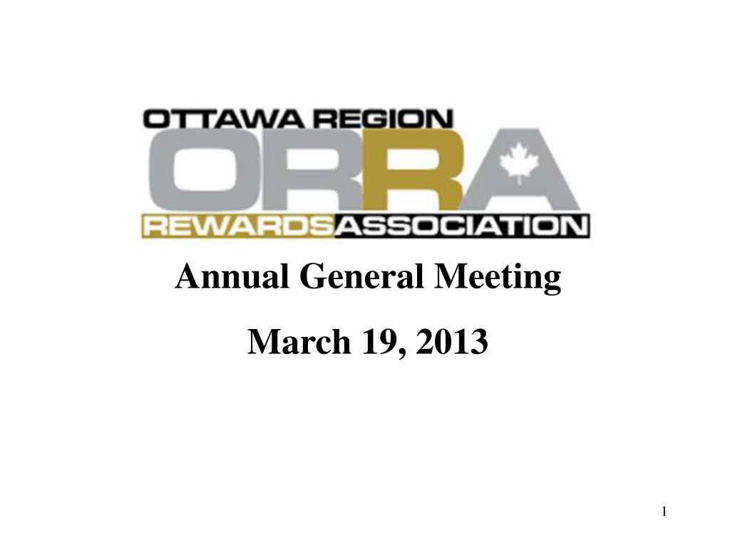 Annual General Meeting March 19, 2013. AGM Agenda. ORRA’s Mission, Value & Structure; Volunteer Opportunities within ORRA; Emphasis in 2013; Financial Update; Resolutions; 2013 Programming Calendar;