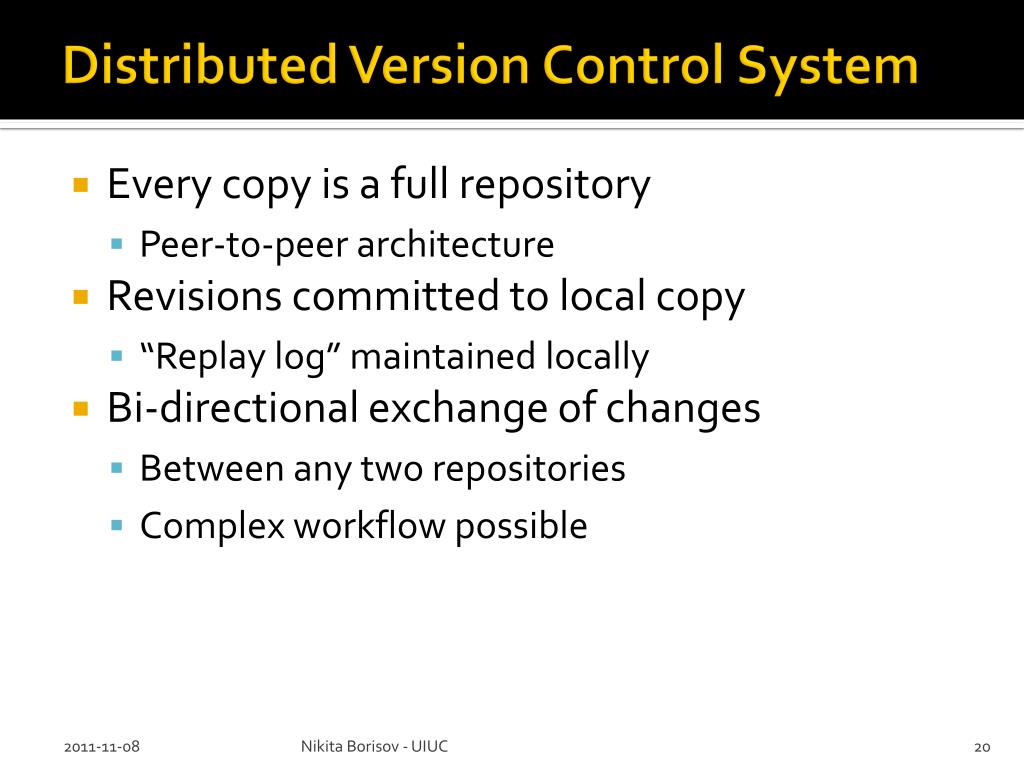 Distributed Version Control System • Every copy is a full repository • Peer-to-peer architecture • Revisions committed to local copy • “Replay log” maintained locally • Bi-directional exchange of changes • Between any two repositories • Complex workflow possible Nikita Borisov - UIUC