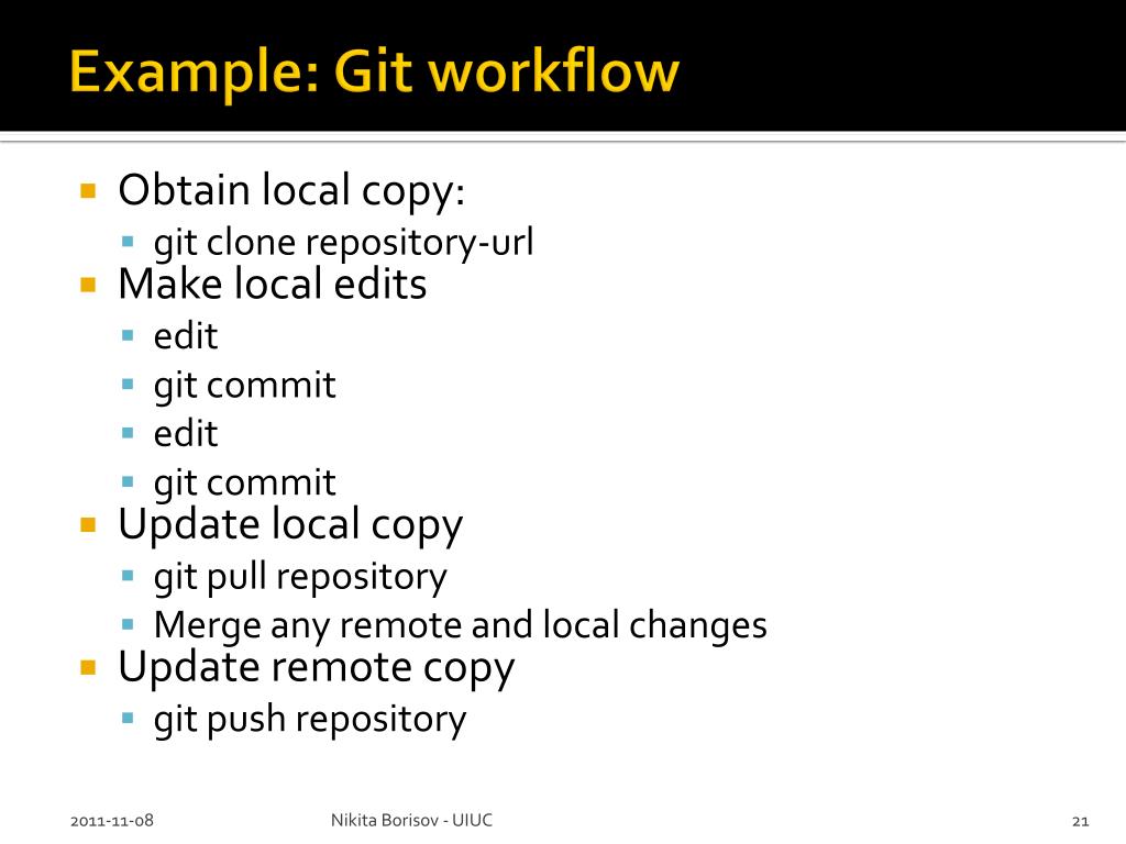 Example: Git workflow • Obtain local copy: • git clone repository-url • Make local edits • edit • git commit • edit • git commit • Update local copy • git pull repository • Merge any remote and local changes • Update remote copy • git push repository Nikita Borisov - UIUC