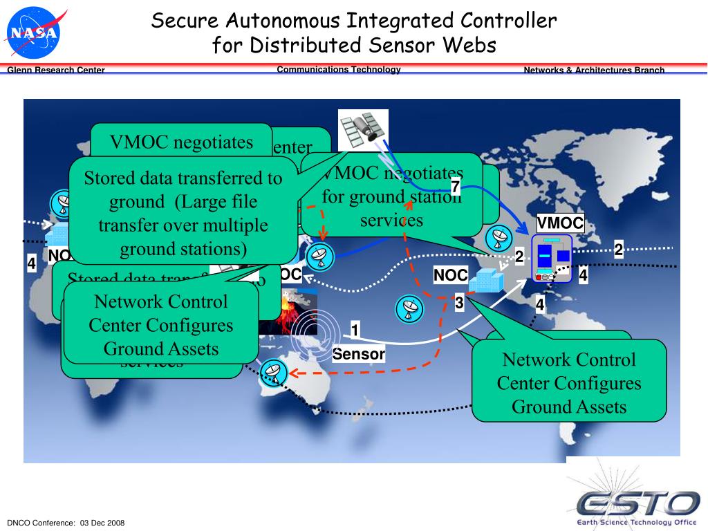 Secure Autonomous Integrated Controller for Distributed Sensor Webs VMOC negotiates for Space Assets Network Control Center Configures Spacecraft via VMOC VMOC negotiates for ground station services Stored data transferred to ground (Large file transfer over multiple ground stations) Space Sensor acquires data (e.g. image) 7 6 3 5 2 2 4 Stored data transferred to ground 4 Network Control Center Configures Ground Assets 3 VMOC negotiates for ground station services 4 1 Seismic Sensor alerts VMOC Network Control Center Configures Ground Assets Sensor 4 VMOC NOC NOC NOC