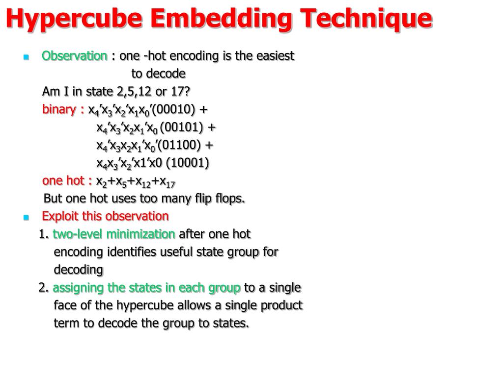 Hypercube Embedding Technique • Observation : one -hot encoding is the easiest to decode Am I in state 2,5,12 or 17? binary : x4’x3’x2’x1x0’(00010) + x4’x3’x2x1’x0 (00101) + x4’x3x2x1’x0’(01100) + x4x3’x2’x1’x0 (10001) one hot : x2+x5+x12+x17 But one hot uses too many flip flops. • Exploit this observation 1. two-level minimization after one hot encoding identifies useful state group for decoding 2. assigning the states in each group to a single face of the hypercube allows a single product term to decode the group to states.