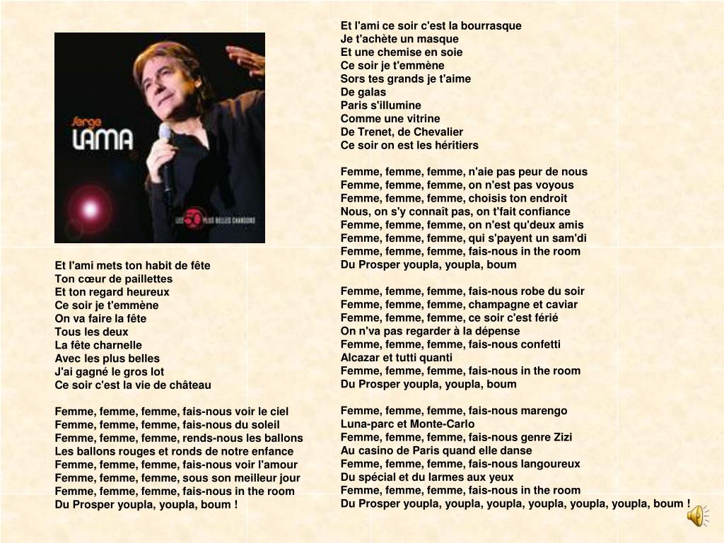 Et l'ami ce soir c'est la bourrasqueJe t'achète un masqueEt une chemise en soieCe soir je t'emmèneSors tes grands je t'aimeDe galasParis s'illumineComme une vitrineDe Trenet, de ChevalierCe soir on est les héritiersFemme, femme, femme, n'aie pas peur de nousFemme, femme, femme, on n'est pas voyousFemme, femme, femme, choisis ton endroitNous, on s'y connaît pas, on t'fait confianceFemme, femme, femme, on n'est qu'deux amisFemme, femme, femme, qui s'payent un sam'diFemme, femme, femme, fais-nous in the roomDu Prosper youpla, youpla, boumFemme, femme, femme, fais-nous robe du soirFemme, femme, femme, champagne et caviarFemme, femme, femme, ce soir c'est fériéOn n'va pas regarder à la dépenseFemme, femme, femme, fais-nous confettiAlcazar et tutti quantiFemme, femme, femme, fais-nous in the roomDu Prosper youpla, youpla, boumFemme, femme, femme, fais-nous marengoLuna-parc et Monte-CarloFemme, femme, femme, fais-nous genre ZiziAu casino de Paris quand elle danseFemme, femme, femme, fais-nous langoureuxDu spécial et du larmes aux yeuxFemme, femme, femme, fais-nous in the roomDu Prosper youpla, youpla, youpla, youpla, youpla, youpla, boum ! Et l'ami mets ton habit de fêteTon cœur de paillettesEt ton regard heureuxCe soir je t'emmèneOn va faire la fêteTous les deuxLa fête charnelleAvec les plus bellesJ'ai gagné le gros lotCe soir c'est la vie de châteauFemme, femme, femme, fais-nous voir le cielFemme, femme, femme, fais-nous du soleilFemme, femme, femme, rends-nous les ballonsLes ballons rouges et ronds de notre enfanceFemme, femme, femme, fais-nous voir l'amourFemme, femme, femme, sous son meilleur jourFemme, femme, femme, fais-nous in the roomDu Prosper youpla, youpla, boum !