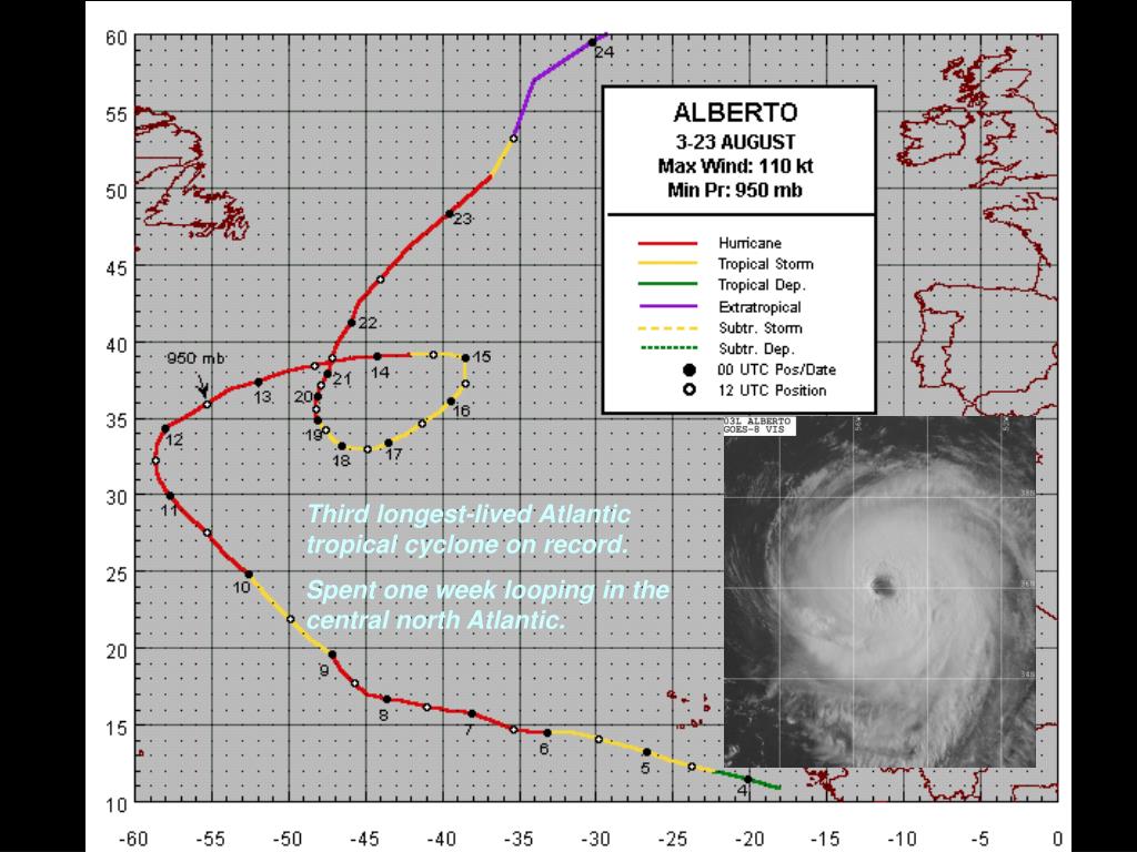 Third longest-lived Atlantic tropical cyclone on record. Spent one week looping in the central north Atlantic.