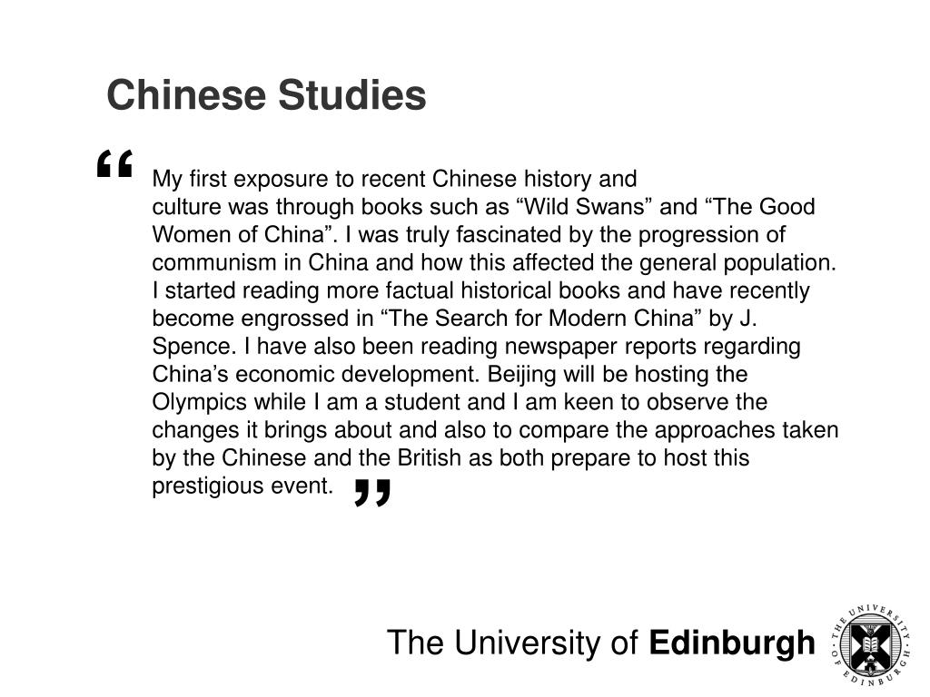 Chinese Studies “ My first exposure to recent Chinese history and culture was through books such as “Wild Swans” and “The Good Women of China”. I was truly fascinated by the progression of communism in China and how this affected the general population. I started reading more factual historical books and have recently become engrossed in “The Search for Modern China” by J. Spence. I have also been reading newspaper reports regarding China’s economic development. Beijing will be hosting the Olympics while I am a student and I am keen to observe the changes it brings about and also to compare the approaches taken by the Chinese and the British as both prepare to host this prestigious event. ” The University of Edinburgh