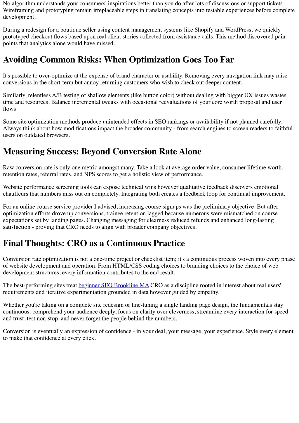 No algorithm understands your consumers' inspirations better than you do after lots of discussions or support tickets. Wireframing and prototyping remain irreplaceable steps in translating concepts into testable experiences before complete development. During a redesign for a boutique seller using content management systems like Shopify and WordPress, we quickly prototyped checkout flows based upon real client stories collected from assistance calls. This method discovered pain points that analytics alone would have missed. Avoiding Common Risks: When Optimization Goes Too Far It's possible to over-optimize at the expense of brand character or usability. Removing every navigation link may raise conversions in the short-term but annoy returning customers who wish to check out deeper content. Similarly, relentless A/B testing of shallow elements (like button color) without dealing with bigger UX issues wastes time and resources. Balance incremental tweaks with occasional reevaluations of your core worth proposal and user flows. Some site optimization methods produce unintended effects in SEO rankings or availability if not planned carefully. Always think about how modifications impact the broader community - from search engines to screen readers to faithful users on outdated browsers. Measuring Success: Beyond Conversion Rate Alone Raw conversion rate is only one metric amongst many. Take a look at average order value, consumer lifetime worth, retention rates, referral rates, and NPS scores to get a holistic view of performance. Website performance screening tools can expose technical wins however qualitative feedback discovers emotional chauffeurs that numbers miss out on completely. Integrating both creates a feedback loop for continual improvement. For an online course service provider I advised, increasing course signups was the preliminary objective. But after optimization efforts drove up conversions, trainee retention lagged because numerous were mismatched on course expectations set by landing pages. Changing messaging for clearness reduced refunds and enhanced long-lasting satisfaction - proving that CRO needs to align with broader company objectives. Final Thoughts: CRO as a Continuous Practice Conversion rate optimization is not a one-time project or checklist item; it's a continuous process woven into every phase of website development and operation. From HTML/CSS coding choices to branding choices to the choice of web development structures, every information contributes to the end result. The best-performing sites treat beginner SEO Brookline MA CRO as a discipline rooted in interest about real users' requirements and iterative experimentation grounded in data however guided by empathy. Whether you're taking on a complete site redesign or fine-tuning a single landing page design, the fundamentals stay continuous: comprehend your audience deeply, focus on clarity over cleverness, streamline every interaction for speed and trust, test non-stop, and never forget the people behind the numbers. Conversion is eventually an expression of confidence - in your deal, your message, your experience. Style every element to make that confidence at every click.