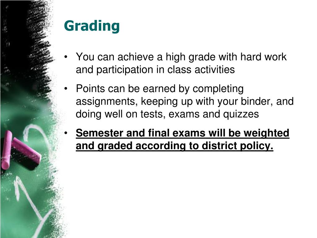 Grading • You can achieve a high grade with hard work and participation in class activities • Points can be earned by completing assignments, keeping up with your binder, and doing well on tests, exams and quizzes • Semester and final exams will be weighted and graded according to district policy.