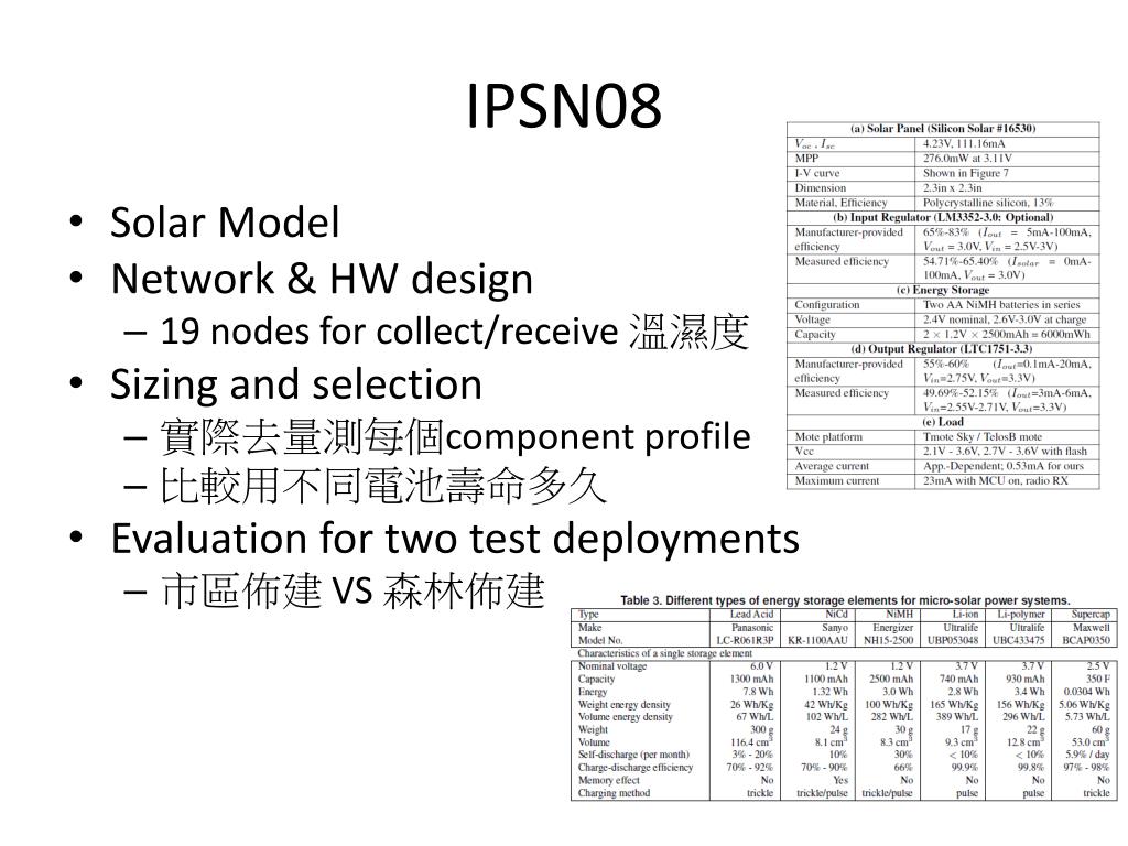 IPSN08 • Solar Model • Network & HW design • 19nodes for collect/receive 溫濕度 • Sizing and selection • 實際去量測每個component profile • 比較用不同電池壽命多久 • Evaluation for two test deployments • 市區佈建 VS 森林佈建