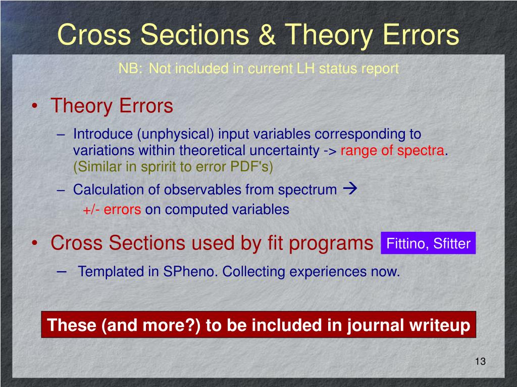 Cross Sections & Theory ErrorsNB:Not included in current LH status report • Theory Errors • Introduce (unphysical) input variables corresponding to variations within theoretical uncertainty -> range of spectra. (Similar in spririt to error PDF's) • Calculation of observables from spectrum +/- errors on computed variables • Cross Sections used by fit programs • Templated in SPheno. Collecting experiences now. Fittino, Sfitter These (and more?) to be included in journal writeup