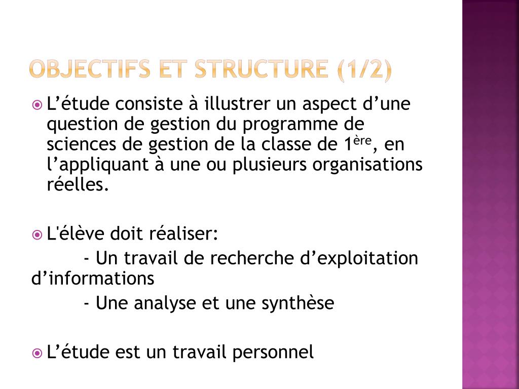 Objectifs et structure (1/2) • L’étude consiste à illustrer un aspect d’une question de gestion du programme de sciences de gestion de la classe de 1ère, en l’appliquant à une ou plusieurs organisations réelles. • L'élève doit réaliser: - Un travail de recherche d’exploitation d’informations - Une analyse et une synthèse • L’étude est un travail personnel