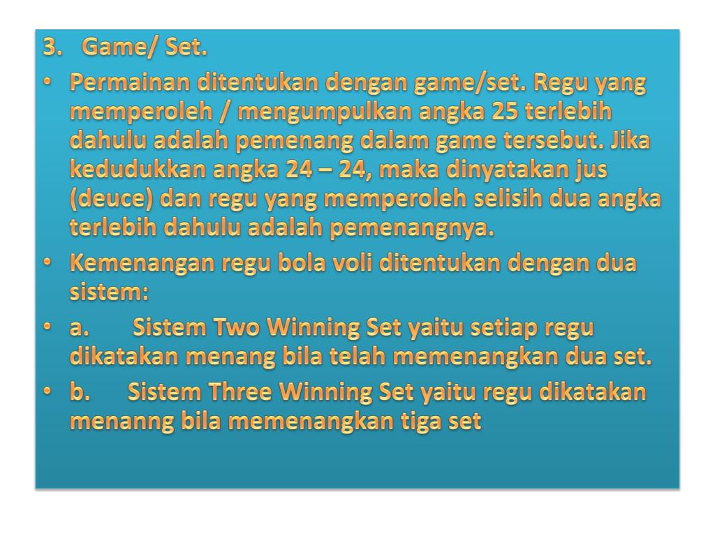 3. Game/ Set. • Permainan ditentukan dengan game/set. Regu yang memperoleh / mengumpulkan angka 25 terlebih dahulu adalah pemenang dalam game tersebut. Jika kedudukkan angka 24 – 24, maka dinyatakan jus (deuce) dan regu yang memperoleh selisih dua angka terlebih dahulu adalah pemenangnya. • Kemenangan regu bola voli ditentukan dengan dua sistem: • a. Sistem Two Winning Set yaitu setiap regu dikatakan menang bila telah memenangkan dua set. • b. Sistem Three Winning Set yaitu regu dikatakan menanng bila memenangkan tiga set