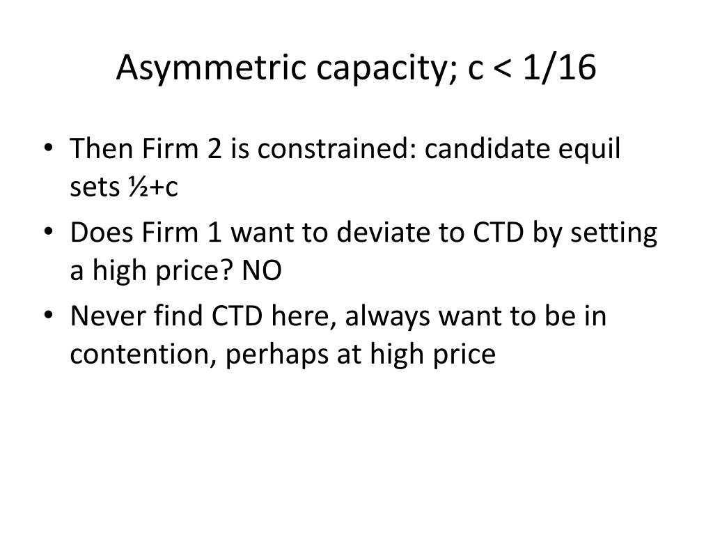 Asymmetric capacity; c < 1/16 • Then Firm 2 is constrained: candidate equil sets ½+c • Does Firm 1 want to deviate to CTD by setting a high price? NO • Never find CTD here, always want to be in contention, perhaps at high price