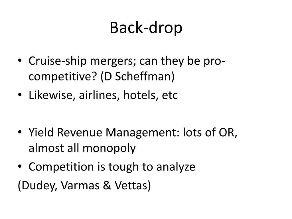 Back-drop • Cruise-ship mergers; can they be pro-competitive? (D Scheffman) • Likewise, airlines, hotels, etc • Yield Revenue Management: lots of OR, almost all monopoly • Competition is tough to analyze (Dudey, Varmas & Vettas)