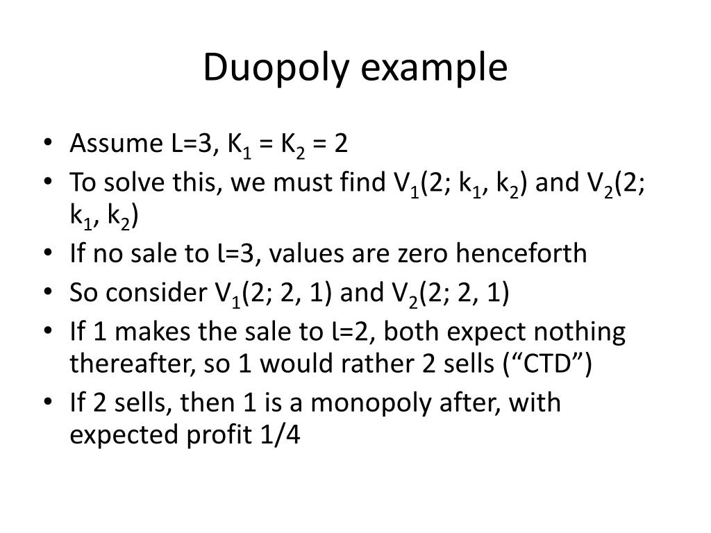 Duopoly example • Assume L=3, K1 = K2 = 2 • To solve this, we must find V1(2; k1, k2) and V2(2; k1, k2) • If no sale to Ɩ=3, values are zero henceforth • So consider V1(2; 2, 1) and V2(2; 2, 1) • If 1 makes the sale to Ɩ=2, both expect nothing thereafter, so 1 would rather 2 sells (“CTD”) • If 2 sells, then 1 is a monopoly after, with expected profit 1/4
