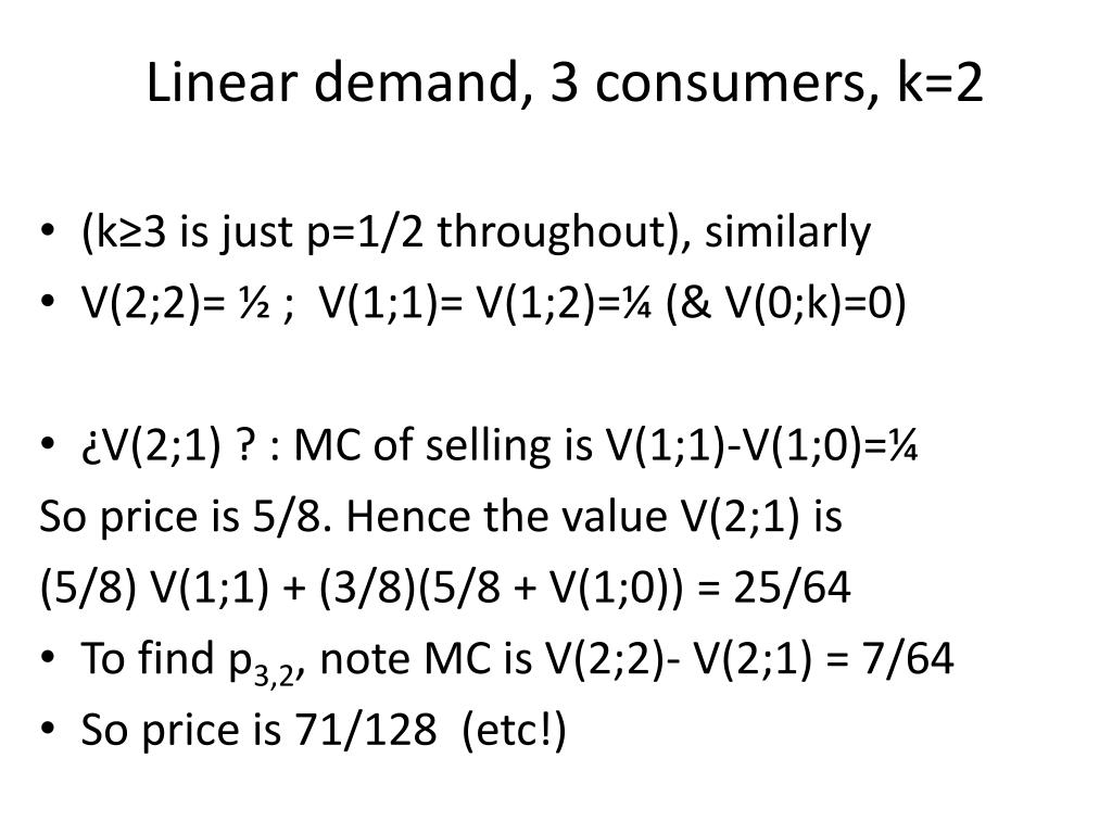 Linear demand, 3 consumers, k=2 • (k≥3 is just p=1/2 throughout), similarly • V(2;2)= ½ ; V(1;1)= V(1;2)=¼ (& V(0;k)=0) • ¿V(2;1) ? : MC of selling is V(1;1)-V(1;0)=¼ So price is 5/8. Hence the value V(2;1) is (5/8) V(1;1) + (3/8)(5/8 + V(1;0)) = 25/64 • To find p3,2, note MC is V(2;2)- V(2;1) = 7/64 • So price is 71/128 (etc!)