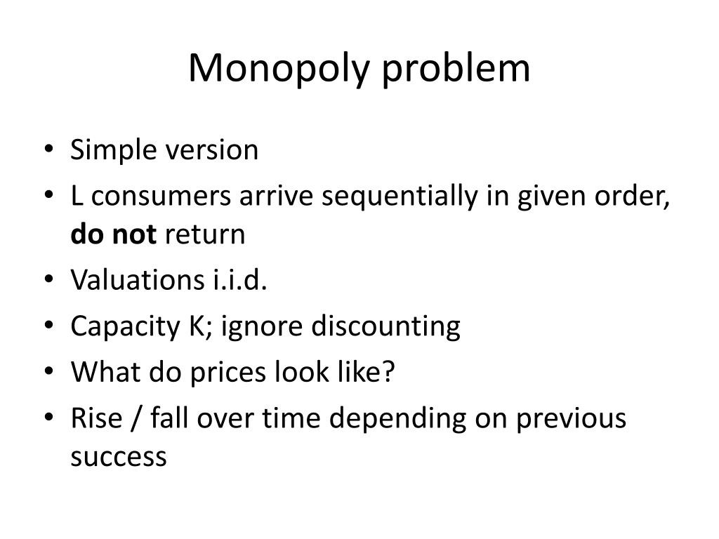 Monopoly problem • Simple version • L consumers arrive sequentially in given order, do not return • Valuations i.i.d. • Capacity K; ignore discounting • What do prices look like? • Rise / fall over time depending on previous success