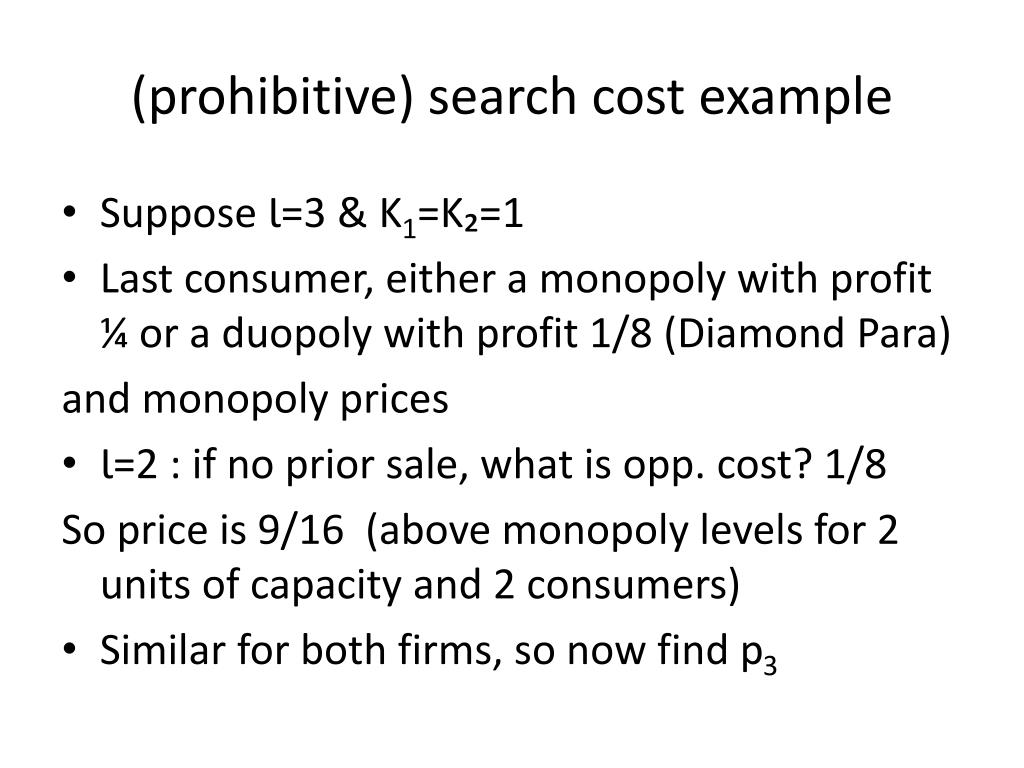 (prohibitive) search cost example • Suppose Ɩ=3 & K1=K₂=1 • Last consumer, either a monopoly with profit ¼ or a duopoly with profit 1/8 (Diamond Para) and monopoly prices • Ɩ=2 : if no prior sale, what is opp. cost? 1/8 So price is 9/16 (above monopoly levels for 2 units of capacity and 2 consumers) • Similar for both firms, so now find p3
