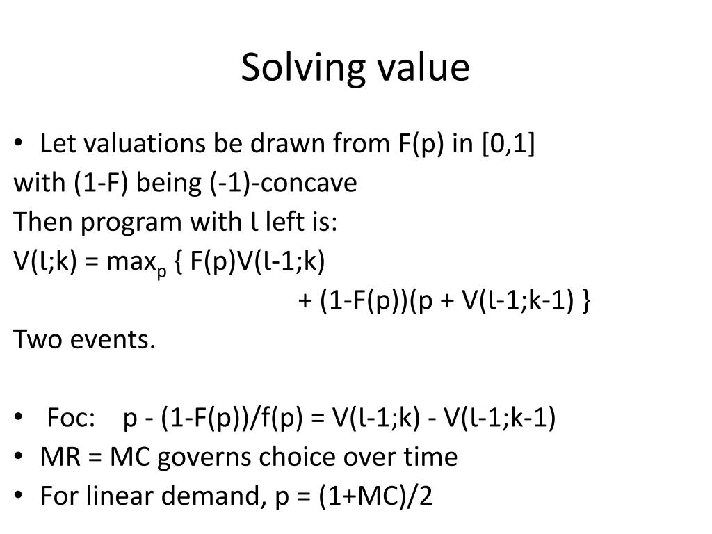 Solving value • Let valuations be drawn from F(p) in [0,1] with (1-F) being (-1)-concave Then program with Ɩ left is: V(Ɩ;k) = maxp { F(p)V(Ɩ-1;k) + (1-F(p))(p + V(Ɩ-1;k-1) } Two events. • Foc: p - (1-F(p))/f(p) = V(Ɩ-1;k) - V(Ɩ-1;k-1) • MR = MC governs choice over time • For linear demand, p = (1+MC)/2