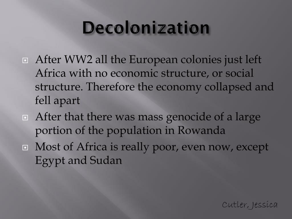 Decolonization • After WW2 all the European colonies just left Africa with no economic structure, or social structure. Therefore the economy collapsed and fell apart • After that there was mass genocide of a large portion of the population in Rowanda • Most of Africa is really poor, even now, except Egypt and Sudan Cutler, Jessica