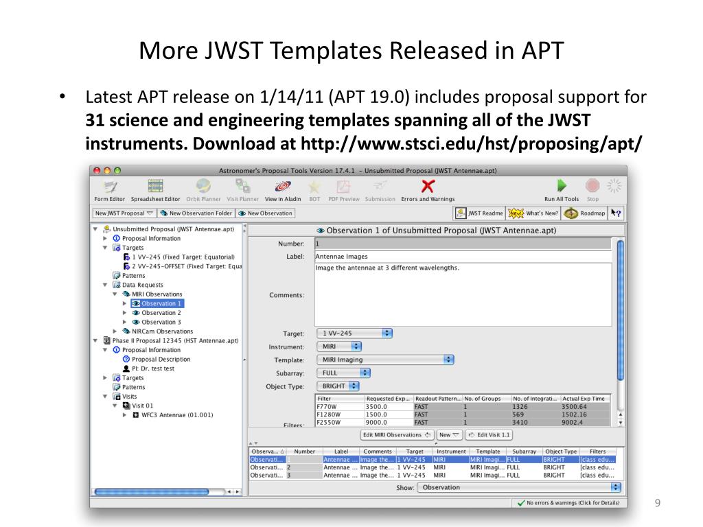 More JWST Templates Released in APT • Latest APT release on 1/14/11 (APT 19.0) includes proposal support for 31 science and engineering templates spanning all of the JWST instruments. Download at http://www.stsci.edu/hst/proposing/apt/