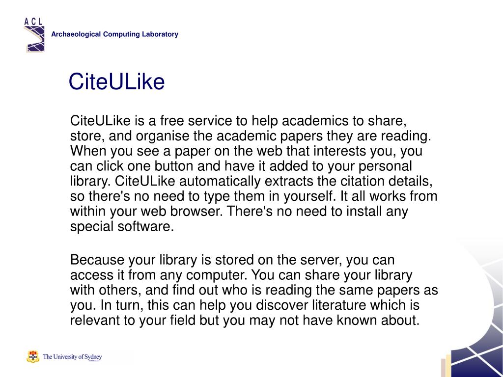 CiteULike CiteULike is a free service to help academics to share, store, and organise the academic papers they are reading. When you see a paper on the web that interests you, you can click one button and have it added to your personal library. CiteULike automatically extracts the citation details, so there's no need to type them in yourself. It all works from within your web browser. There's no need to install any special software. Because your library is stored on the server, you can access it from any computer. You can share your library with others, and find out who is reading the same papers as you. In turn, this can help you discover literature which is relevant to your field but you may not have known about.