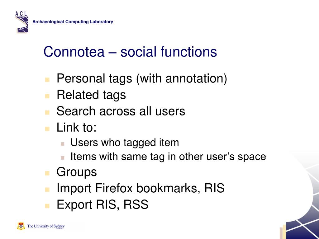 Connotea – social functions • Personal tags (with annotation) • Related tags • Search across all users • Link to: • Users who tagged item • Items with same tag in other user’s space • Groups • Import Firefox bookmarks, RIS • Export RIS, RSS
