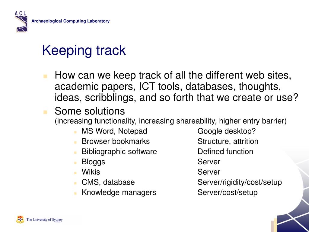 Keeping track • How can we keep track of all the different web sites, academic papers, ICT tools, databases, thoughts, ideas, scribblings, and so forth that we create or use? • Some solutions(increasing functionality, increasing shareability, higher entry barrier) • MS Word, Notepad Google desktop? • Browser bookmarks Structure, attrition • Bibliographic software Defined function • Bloggs Server • Wikis Server • CMS, database Server/rigidity/cost/setup • Knowledge managers Server/cost/setup